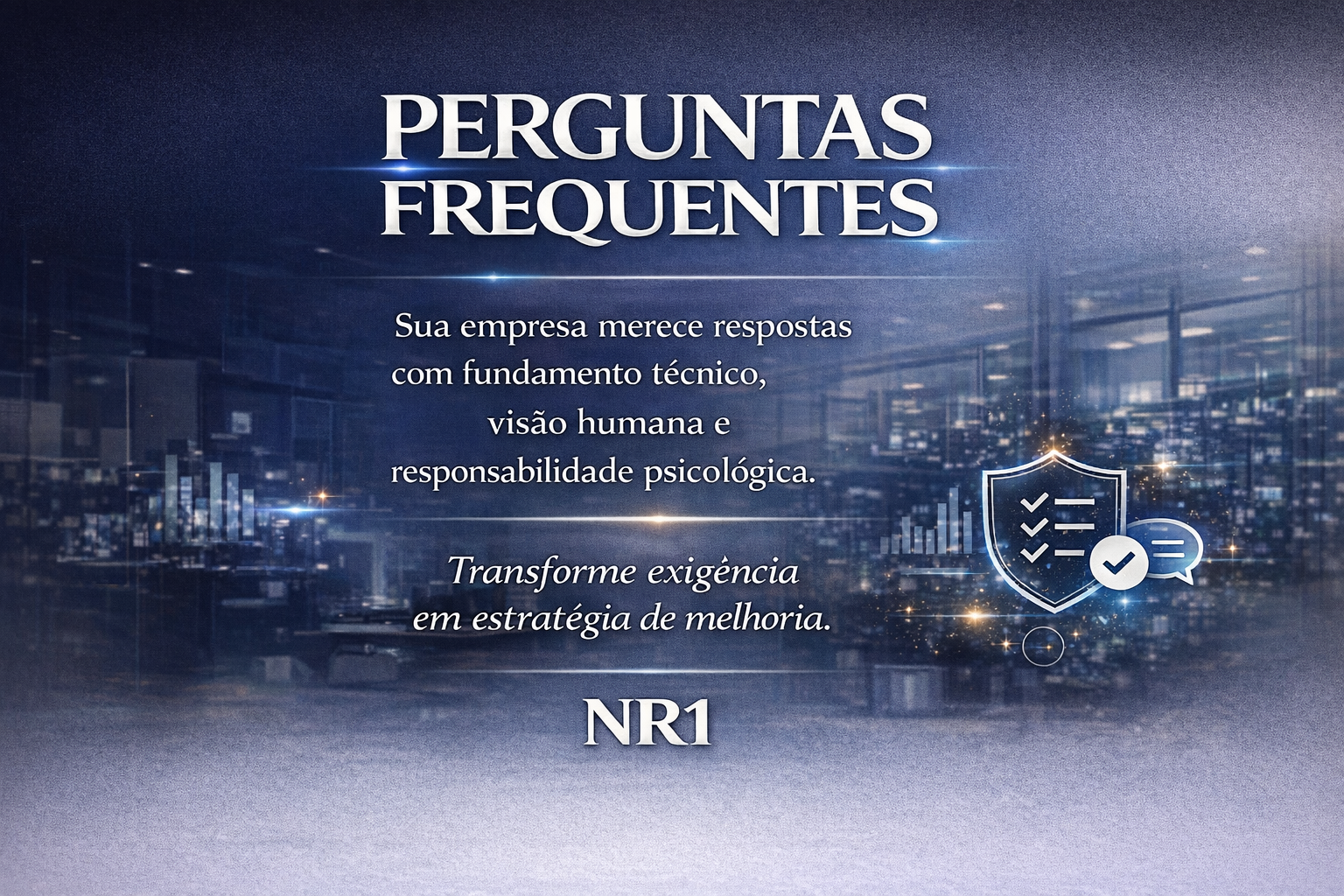 Nossa missão é reforçar sua estrutura organizacional, garantindo que sua empresa esteja — e permaneça — plenamente amparada pela legislação NR-1, com respaldo psicológico e jurídico seguro, responsável e tecnicamente fundamentado, sempre em conformidade com a nova regulamentação.